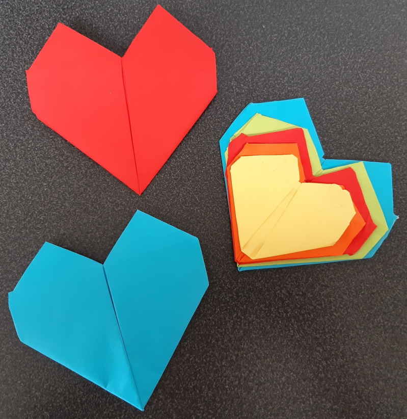 Je kan hartjes vouwen in verschillende kleuren en groottes en ze dan op elkaar kleven.