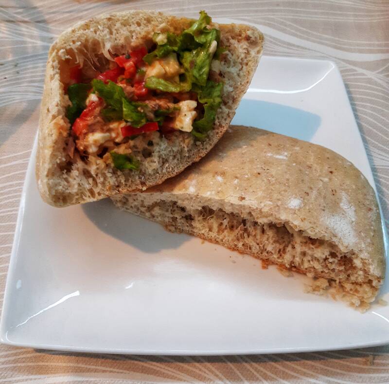 Ik heb 400g bloem genomen en 100g tarwemeel. Zo krijg je lichte grove pitabroodjes.