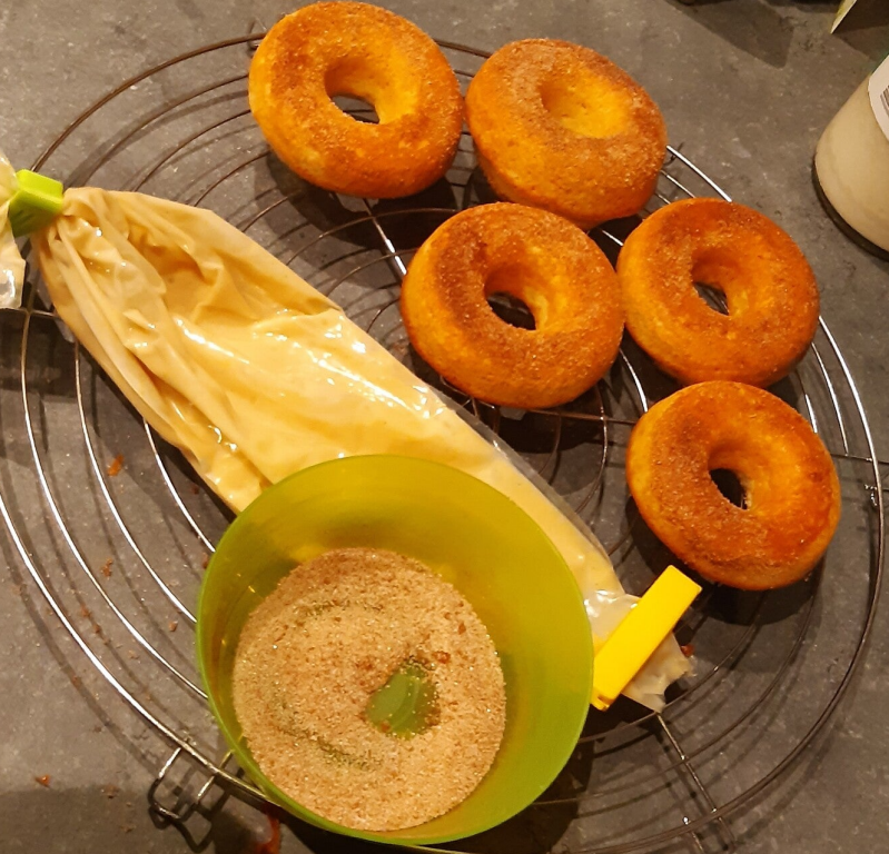 We hebben ze afgewerkt met wat kaneelsuiker: meng kristalsuiker met kaneel. Strijk de onder- en de bovenkant van de donut in met wat gesmolten boter en dop ze in de kaneelsuiker.