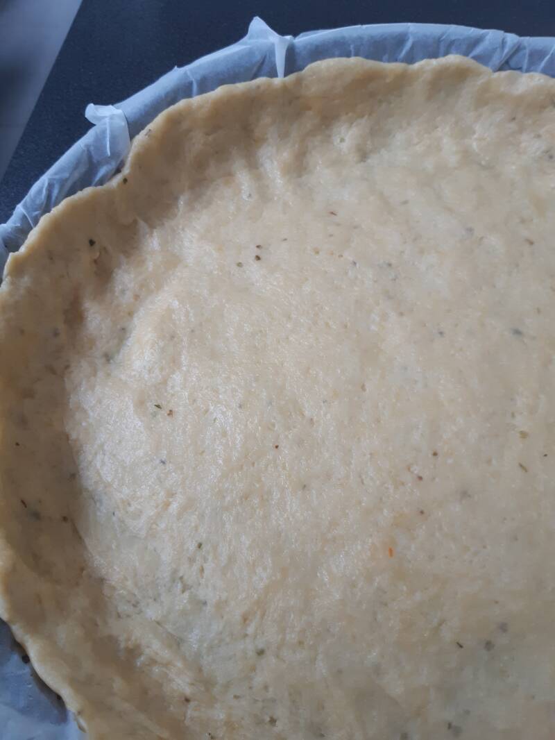 Neem een ronde bakvorm. Een beetje vettig maken met wat olie en dan een vel bakpapier er in plakken. Ik rol het deeg niet uit met mijn deegrol maar duw het deeg met mijn handen plat in mijn bakvorm. Je hebt er even geduld voor nodig maar het gaat eigenlijk redelijk vlot. Gewoon duwen met je vlakke hand en je bakvorm rond draaien. Duwen tot je bodem volledig bedekt is en je een mooi randje hebt aan je deeg.
