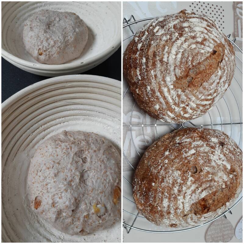 Zuurdesembrood met gedroogde vijgen en noten. In het groentepakket van de deze week zaten er gedroogde vijgen dus dat kwam goed uit! 😊 En walnoten heb ik altijd in huis.