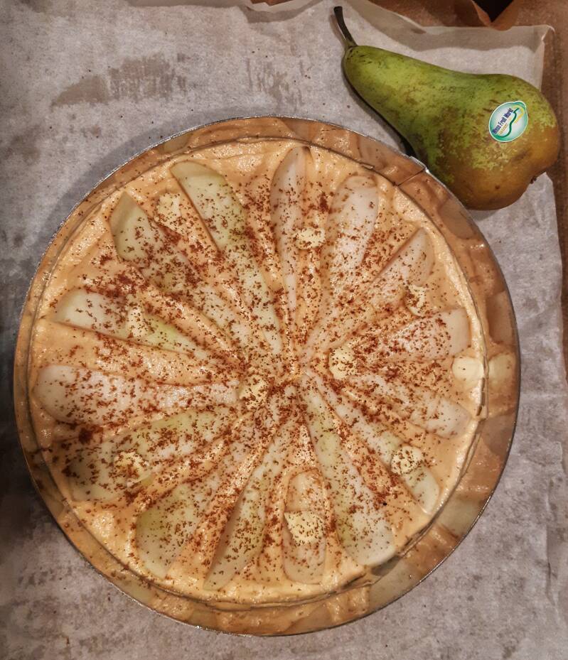 Nog een paar boterklontjes op de peren leggen en wat bruine suiker over strooien en je taart/cake mag in de oven.