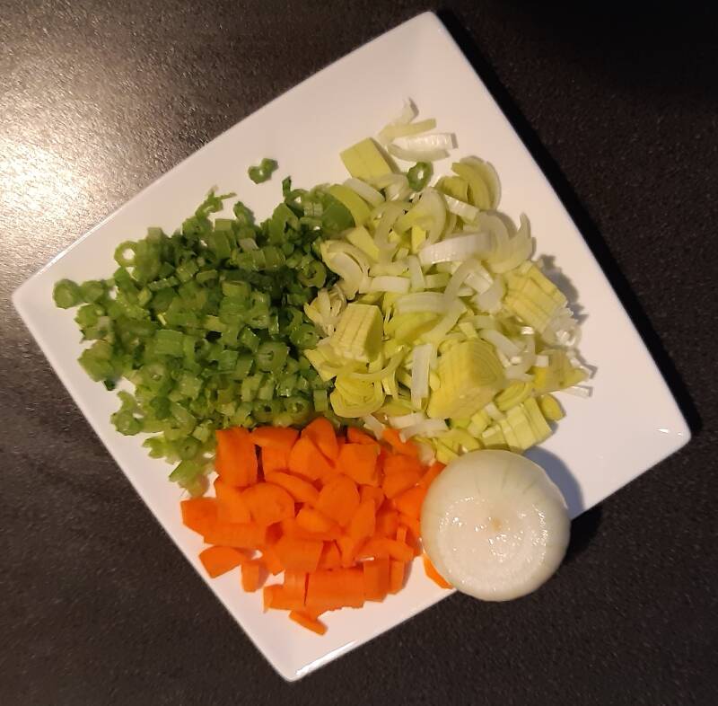 - Snij de wortel, selder en prei mooi fijn en spoel alle groenten goed zodat het zand goed van de prei en de selder gespoeld is.