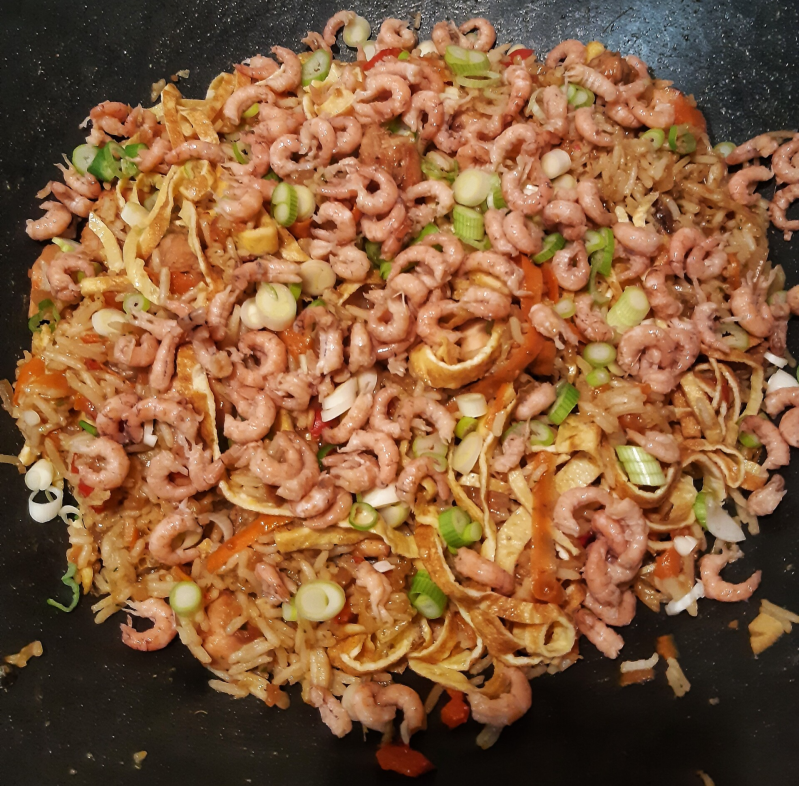 Dan heb ik 2 dunne omeletjes gebakken van 3 eieren. Oprollen, in dunne schijfjes snijden en toevoegen aan de Nasi.