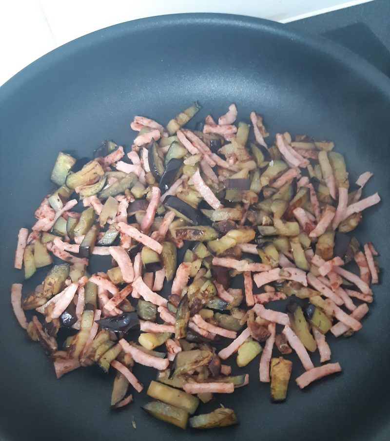 Ik heb een halve aubergine in stukjes gesneden en mooi krokant gebakken in wat boter.