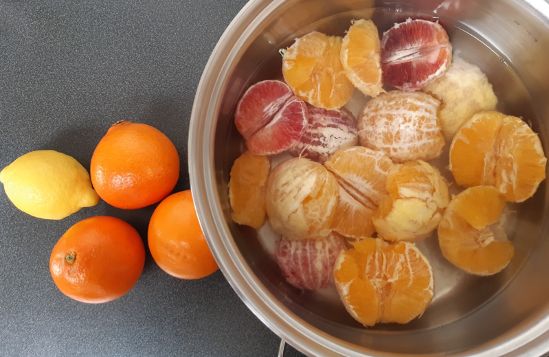 Onze fruitschaal lag vol met appelsienen. Té veel om allemaal op te eten. Dus maken we appelsienconfituur!
