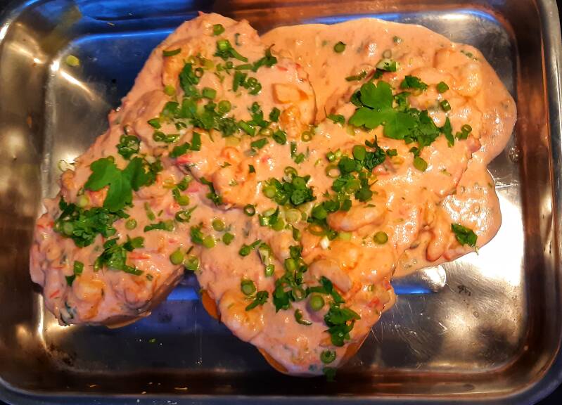 Haal de gare pompoen uit de oven en vul hem op met het scampi-mengsel. Werk eventueel af met wat extra kaas en de cheiro-verde.