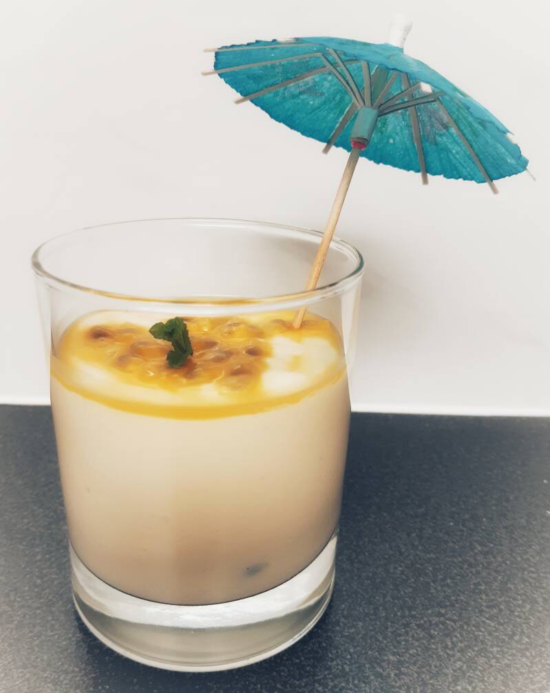 Warm dit even op om de suiker te laten smelten. Werk de glaasjes af met een lepeltje passievruchtensaus.