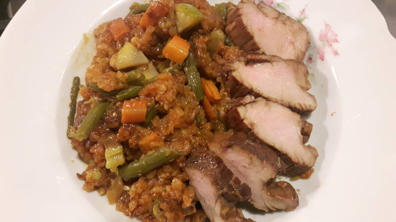 Neem een wok of pan en doe als volgt: zonnebloemolie erin, de filet, toeschroeien, filet eruit en in oven doen op 100°C – hou de marinade bij voor straks. In dezelfde pan, weer een beetje olie, dan de wortelblokjes, even roeren, de spice paste, roeren, een lepel geconcentreerde tomatenpuree, evenveel kecap manis, roeren, dan de rijst erbij, de boontjes of erwtjes, roeren, nog een lepel soja saus en de pijpajuin, blijven roeren, ik doe er dan nog graag een klein potje gepelde verse garnaaltjes in, roeren, en als je het vuur al hebt afgezet, doe je er nog in blokjes gesneden komkommer aan toe. Klaar! 😊